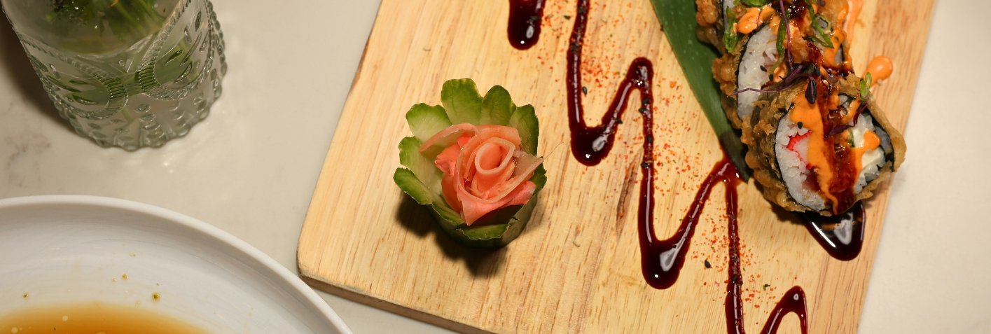 COCONUT SHRIMP, CRAB SALAD, TEMPURA, AVOCADO, CREAM CHEESE, FRESH SALMON AND TUNA, FRESH MANGO SAUCE