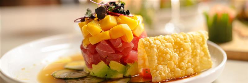BLUE FIN TUNA, BLACK CAVIAR, MANGO, AVOCADO, PONZU SAUCE, WONTON CRISPS